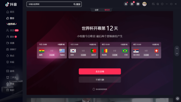 下载抖音电脑客户端,免费看世界杯赛事直播。下载地址:mydown.yesky.com/pcsoft/413545071.html