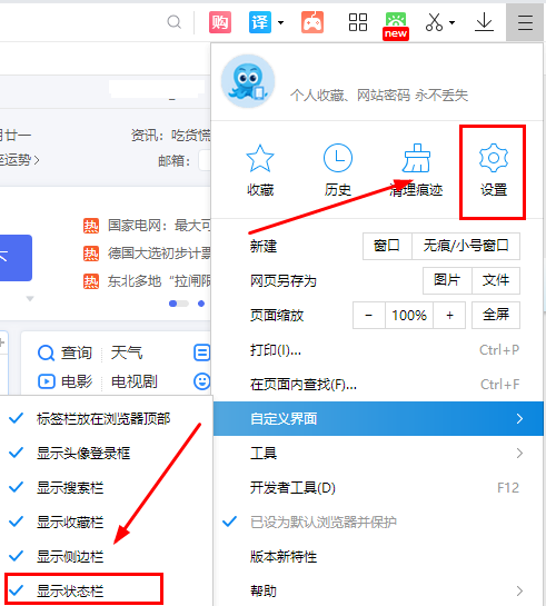 5、若在菜单列表中找不到【自定义界面】,我们可以直接点击菜单列表内的【设置】选项,在浏览器选项基本设置页面中有【自定义界面】,在这里勾选【显示状态栏】选项也可。