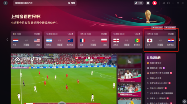如果大家想准时观看2022世界杯,日本vs克罗地亚的八分之一决赛,那就来抖音电脑版!这里不仅能看日本队八分之一决赛的直播,还能对2022世界杯赛程进行全程跟进,一直看到2022年12月18日总决赛那天,都是没问题的。