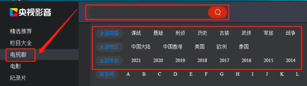 小编这里以电视剧搜索为例,打开CBox央视影音后,在主界面左侧的选项栏中,点击“电视剧”,右侧就会对应出现分类选项和电视剧库。之后,我们可以根据不同的电视剧类型,出品地点以及时间,来筛选电视剧。当然了,如果知道电视剧的名字或者是关键词,也可以直接在搜索框中输入名字来查找。