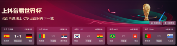 我们打开抖音,进入2022卡塔尔世界杯版块之后,可以点击界面右上方【大力神杯图片】右下角的【晋级形势】按钮,即可进入抖音2022世界杯晋级积分表。