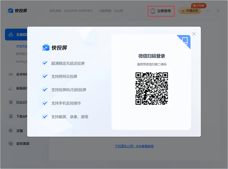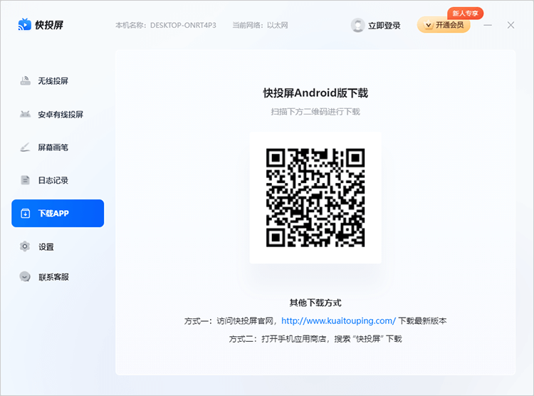点击「下载APP」按钮,可通过该页面扫描二维码或访问官网下载快投屏APP。