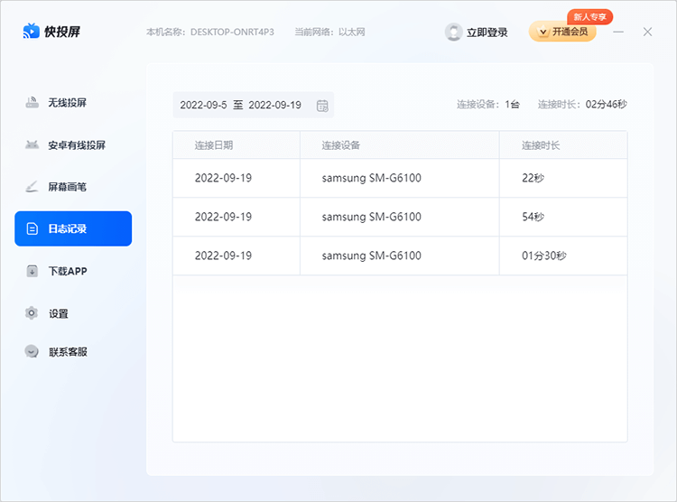 点击「日志记录」按钮,可通过该页面查看投屏的连接日期、连接设备、连接时长等日志信息。