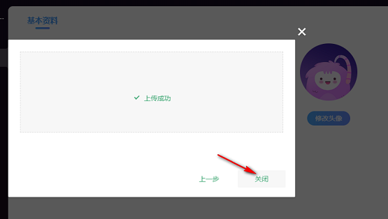 5、点击“保存”之后,我们在页面中可以看到“上传成功”字样,最后点击“关闭”即可(如图所示)。