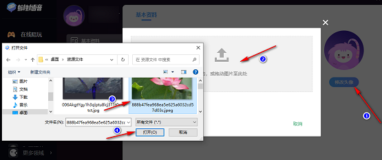 3、在基本资料页面中,我们点击右侧的“修改头像”选项,然后在弹框中点击上传图片出,最后在文件夹页面中找到自己想要上传的照片,然后点击“打开”选项(如图所示)。
