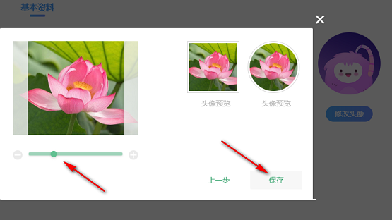 4、打开照片之后,我们在页面中拖动滑块更改照片大小,接着在右上角查看头像效果,满意之后点击“保存”选项(如图所示)。