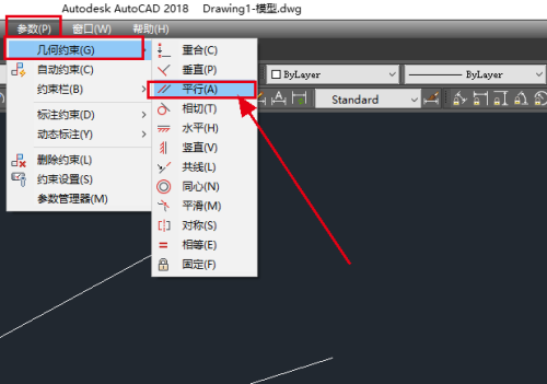 第四步:找到标题栏里面的“参数”,点开找到“几何约束”,再点开“几何约束”找到里面的“平行”。
