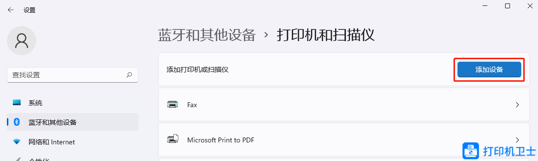 点击【打印机和扫描仪】后,点击【添加设备】系统会自动搜索电脑已连接的打印机。