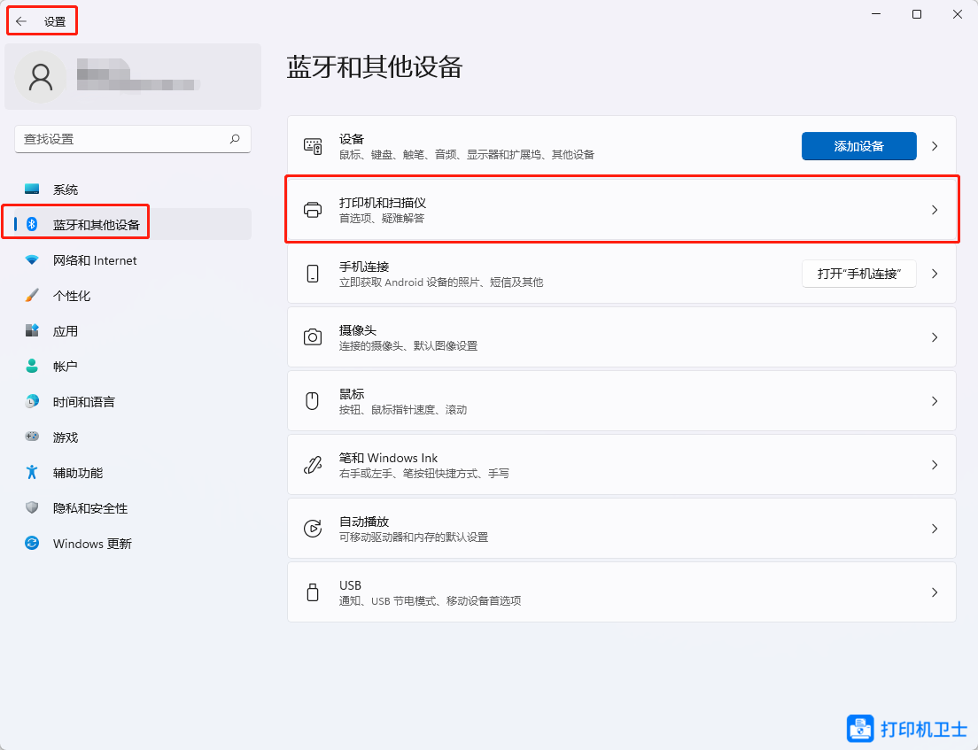 首先我们需要将佳能打印机的USB接扣正确插入电脑,确认是否完全插入,并查看是否有亮灯,确认接口正确接入,并打开电脑系统中的【设置】-【蓝牙和其他设备】-【打印机和扫描仪】。