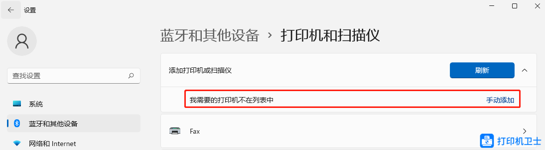 当长时间未出现自己的打印机型号时,会出现“我需要的打印机不在列表中”,则需要点击【手动添加】进入到手动添加打印机环节。
