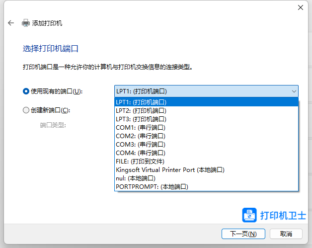 一般来说,默认为LPT1,点击下一步找到相应的打印机型号即可。