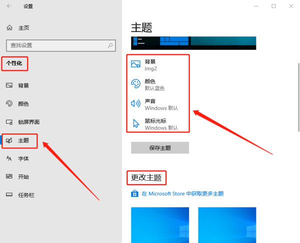 同样在个性化设置界面,点击“主题”,可以在右侧窗口中,对背景、颜色、声音以及鼠标光标进行个性化设置。也可以在“更改主题”栏中,选择其他已经设置好的主题,双击鼠标左键就能进行更换。