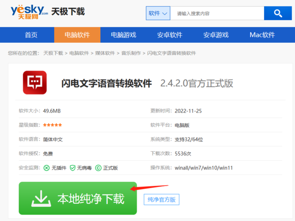 ?本站下载。为了能让大家非常轻松地就能找到闪电文字语音转换软件的下载方式,本站便给大家提供下载资源,大家只需点击软件详情页面中的【本地纯净下载】,即可开始下载闪电文字语音转换软件,本站提供的下载资源可以说是非常安全。