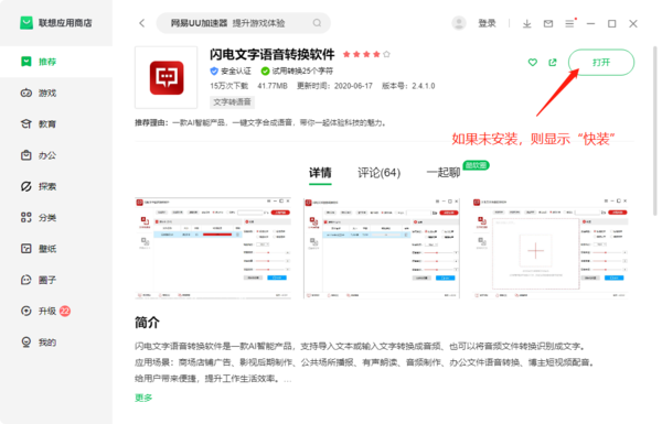?软件商店下载。毕竟,像是闪电文字语音转换软件这样实用的软件,在360软件管家、腾讯软件管家、天极软件管家等,均可以下载。这里以联想软件商店为例,我们进入软件商店后,在搜索栏输入【闪电文字语音转换软件】,然后在软件详情页面点击【快装】即可下载安装闪电文字语音转换软件。