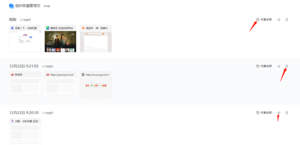 打开搜狗浏览器【临时收藏管理页】,在这里我们可以看到已添加至临时收藏中的内容,如果我们想恢复,那就点击右侧【恢复全部】,即可将页面恢复显示。