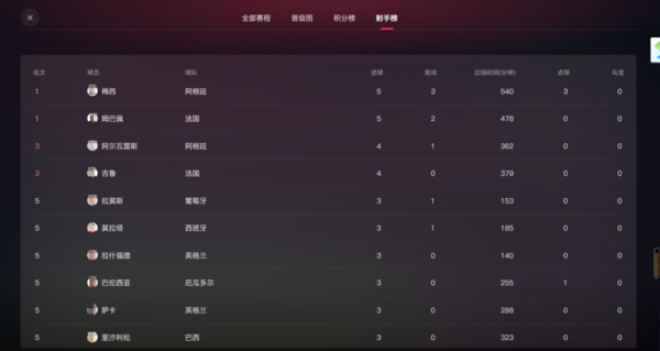 根据查找多方面的资料内容来看,截止至本文发布,梅西占据2022世界杯射手榜第一位,出场时间540分钟,交出了5球3助的数据。而姆巴佩占据射手榜第二位,出场时间478分钟,交出了5球2助的数据。两人都制造了5进球,实力依旧势均力敌。虽然小编更看好梅西夺冠,但是姆巴佩的实力也不容小觑。而2022卡塔尔世界杯决赛将于北京时间12月18日23:00打响,让我们一同期待冠军的诞生吧。