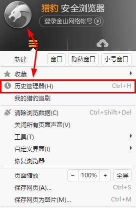 ·选择菜单列表中的【历史管理器】就能将猎豹浏览器的历史记录打开了(也可使用快捷键Ctrl+H)。