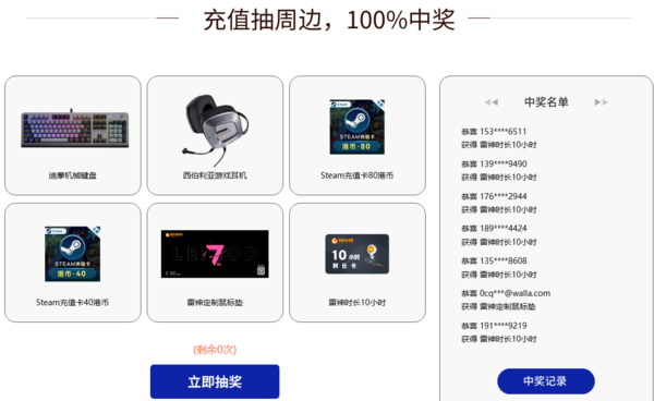 而且,玩家在活动期间购买礼包后,可以获得抽奖的机会,如图,在活动页面中抽奖有机会获得机械键盘、游戏耳机、鼠标垫、额外的加速时长等。