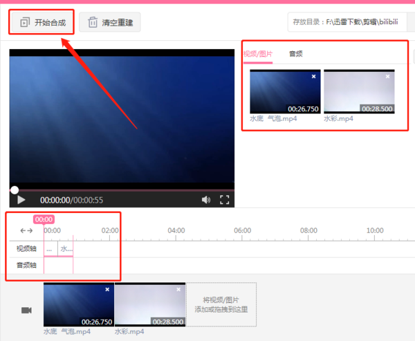 第七步:剪切完成并排列好后,可以在上方的视窗中,预览播放视频效果,没有问题后选择左上方“开始合成”,就剪辑完成了。