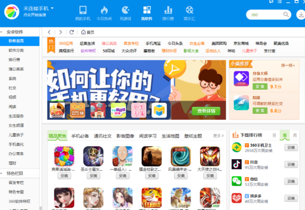 这是一款安卓手机的资源获取和管理平台。软件提供海量的游戏、软件、音乐、小说、视频、图片,通过它轻松下载、安装、管理手机资源,不怕手机数据丢失。所有提供的信息资源,全部经过360安全检测中心的审核认证,绿色无毒,安全无忧。