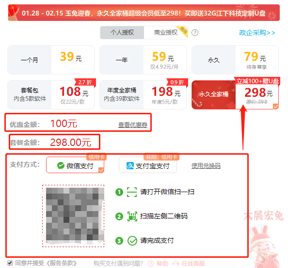 在金舟格式工厂兔年新春活动期间内,对于需要开通金舟格式工厂会员的朋友们,可以享受购买会员“满300减100”的优惠,换句话说,当我们开通个人/商业版永久全家桶时,可以凭此获得减100元的优惠,非常值得!