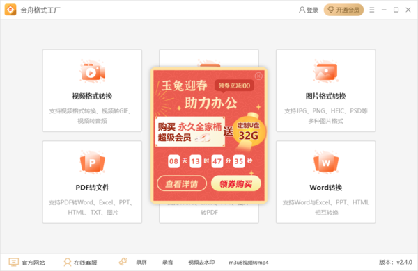 今天已经是2023年2月7日,我们刚度过了正月十五,从热闹的春节逐渐转入至忙碌的工作中,这也意味着我们又要接触电脑中的若干办公软件了。这段时间里,金舟格式工厂也推出了兔年新春优惠福利;到目前,离活动结束只有8天了!还没冲的朋友们可抓紧了;如果你想了解金舟格式工厂兔年新春活动,那还请继续看阅读以下内容~