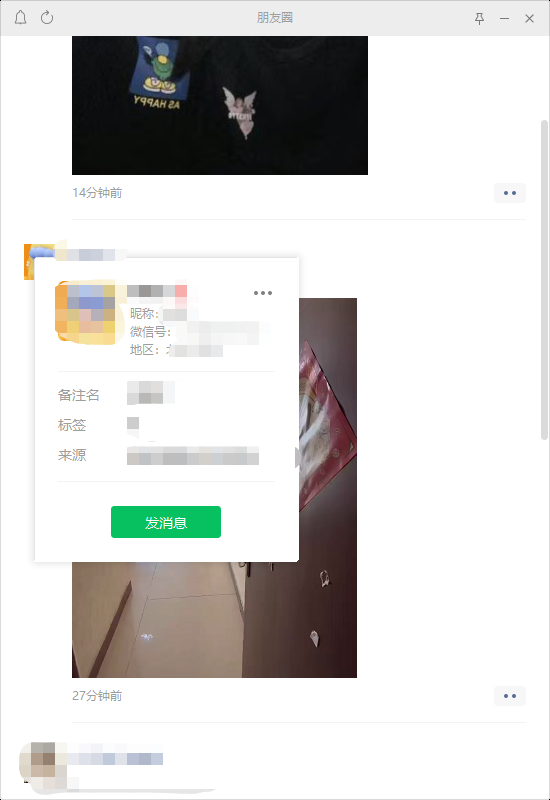 答案是不能,小编测试,我们点进电脑微信的朋友圈后,虽说可以看到实时的朋友圈内容,也可以实时进行点赞评论,但是我们无法进入个人或好友的主页看朋友圈,点击好友头像只能显示【发消息】按钮和好友基础信息,并没有进入好友朋友圈主页的渠道。