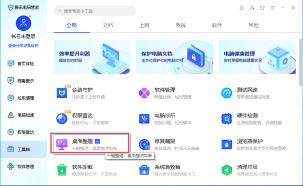 进入到电脑管家的工具箱界面当中后,找到界面右侧的【桌面整理】功能,并点击进行添加,如果是首次添加该功能的话,需要等待功能完成下载和安装,耐心等待一会儿即可。