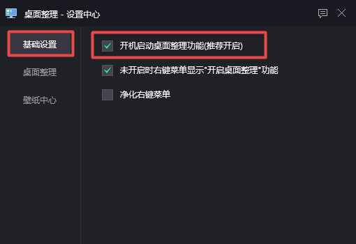 第二步,进入到桌面整理工具的设置中心界面当中后,找到界面左侧的【基础设置】选项,并点击进入。最后在右侧的界面中,找到【开机启动桌面整理功能】选项,并进行勾选即可。