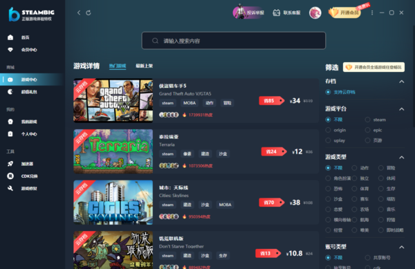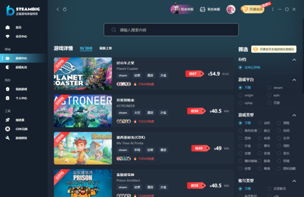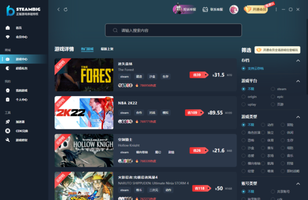 根据查找到的资料来看,有云存档游戏的软件是steambig,而在steambig游戏平台上,我们不仅可以玩支持云存档类的游戏,还可以玩航海、狩猎、冒险、角色扮演等众多种类的游戏呢,游戏种类可以说是多种多样,游戏资源也是非常的丰富。