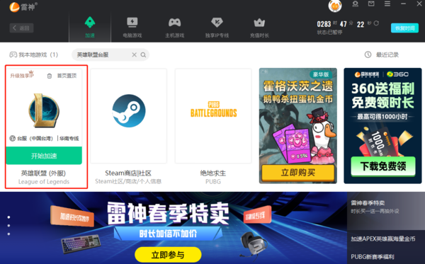 Ⅲ、360游戏加速器:360游戏加速器支持英雄联盟台服,能够提高游戏的稳定性和流畅度,降低延迟,可以有效地改善游戏体验。