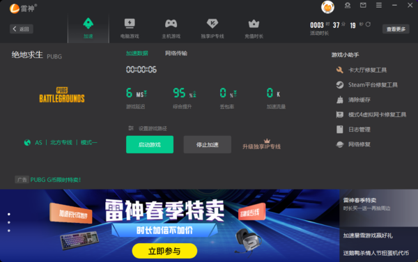 此外,说到这雷神加速器和吃鸡,联动还有很多,其中一项就是我们可以用雷神加速器解决吃鸡卡大厅问题,下面我们一起看看如何用雷神加速器解决吃鸡卡大厅问题。