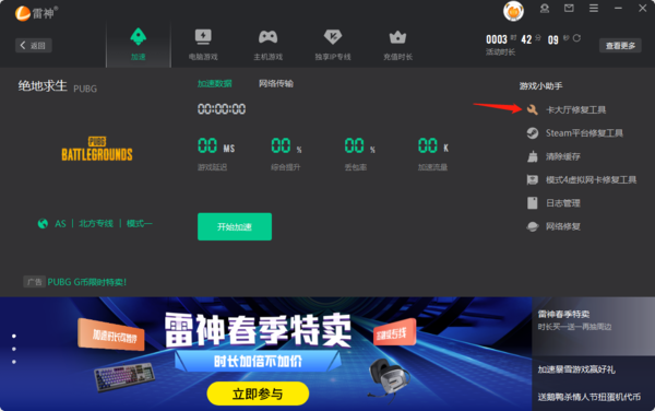 如果我们玩吃鸡的时候,发现经常会卡大厅,那我们可以在雷神加速器中,进入吃鸡加速界面后,点击右侧的【卡大厅修复工具】;
