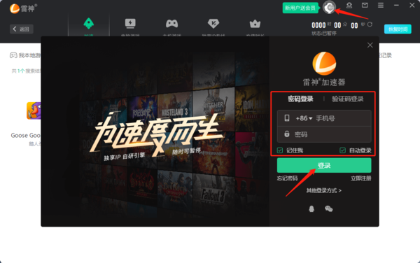 1、我们在打开雷神加速器之后,需要点击右上角【头像】处,登录账号;