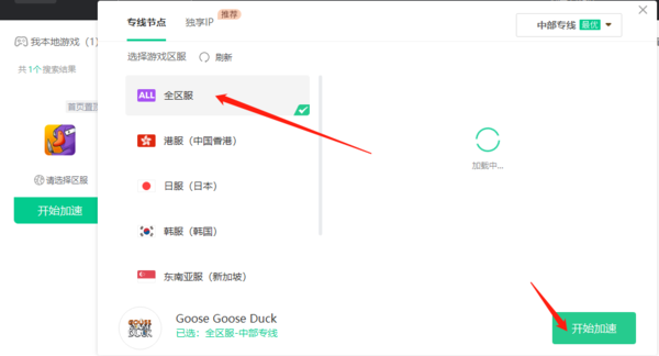 3、在加速前,我们还可以选择鹅鸭杀的加速区服,一般情况,如果我们选择【全区服】即可;