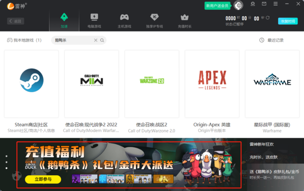 到这里,关于雷神加速器加速鹅鸭杀的操作,就给大家介绍完了;此外,雷神加速器在近期还提供“雷神加速器?x?鹅鸭杀”联动活动,下文将给大家介绍一下雷神加速器鹅鸭杀联动活动。