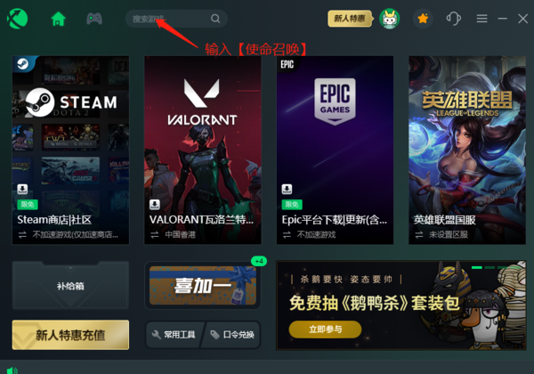 在打开迅游加速器之后,我们可以在上方搜索栏中输入【使命召唤】,再键盘敲击【回车】搜索。