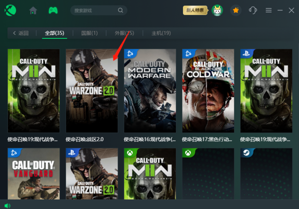 在搜索结果中我们可以看到若干款【使命召唤】相关游戏,其中就包括COD战区2(使命召唤:战区2.0);点击即可开始加速COD战区2。