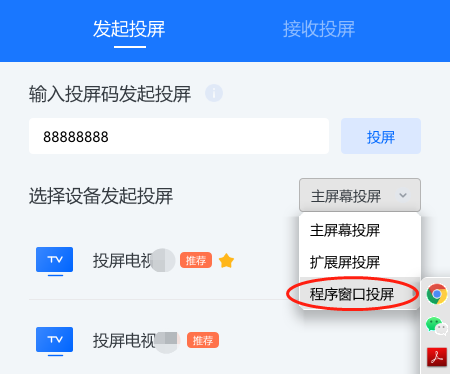 1、在【发起投屏】——【选择设备发起投屏】中点击——【程序窗口投屏】并选择一款指定的软件,即可设置完毕。