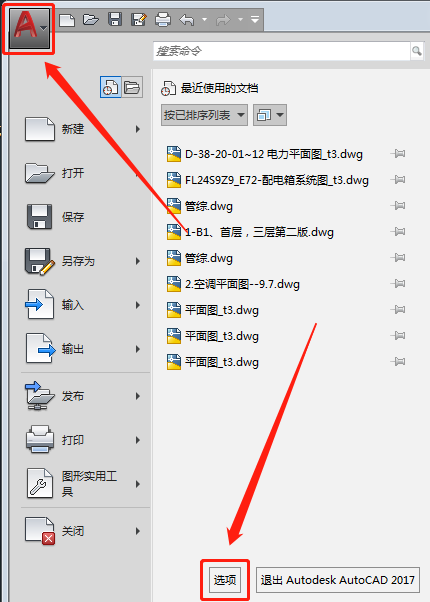 3.在CAD主界面,点击左上角的CAD软件图标,在出现的下拉窗口中,点击右下角的“选项”,也可以打开选项界面。