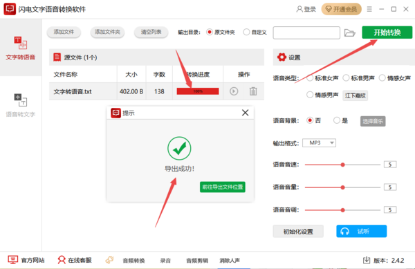 第四步,最后点击界面右上角的【开始转换】按钮,等待文字向粤语语音转换完成即可。
