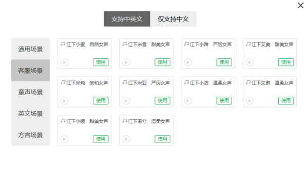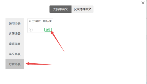 第三步,接着在弹出的窗口中,点击左侧列表中的【方言场景】选项,然后我们就可以看到粤语女声的选项了,点击【使用】按钮。