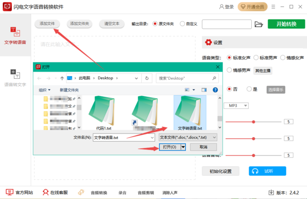 第一步,启动闪电文字语音转换软件,然后点击左上角的【添加文件】按钮,然后将需要进行转换的文字文档添加进来。