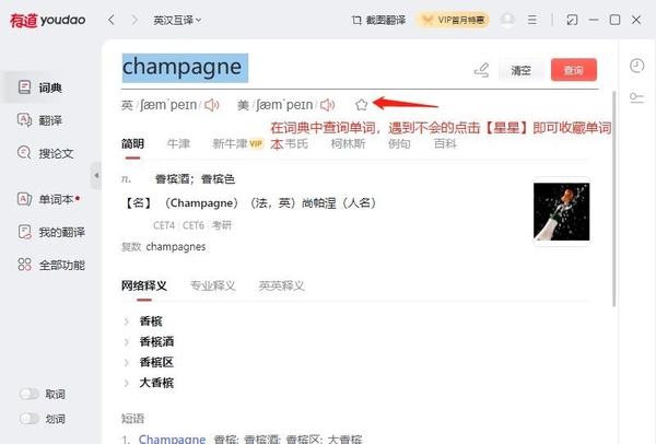 如果我们想将生词添加至有道词典的单词本,那么需要先在网易有道词典的【单词】模块中,搜索到生词,再点击其中的【星星】按钮,即可将生词添加至有道词典的单词本。