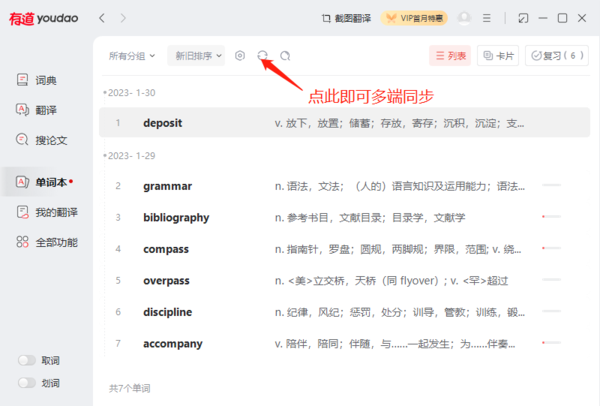 网易有道词典的单词本,是可以实现多端同步的;如果我们想进行多端同步,只需点击图示中的按钮,即可进行同步,操作非常简单。