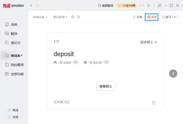 ?单词卡片。网易有道词典的单词本,还有【单词卡片】模式,使用该模式,可以让我们更好的去学习巩固曾经不会的单词。