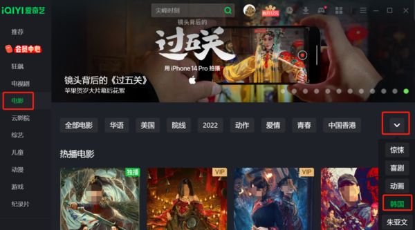 我们点击左侧菜单栏【电影】——并点击右侧的向下箭头后选择【韩国】。即可找到爱奇艺电脑版的韩国电影啦。