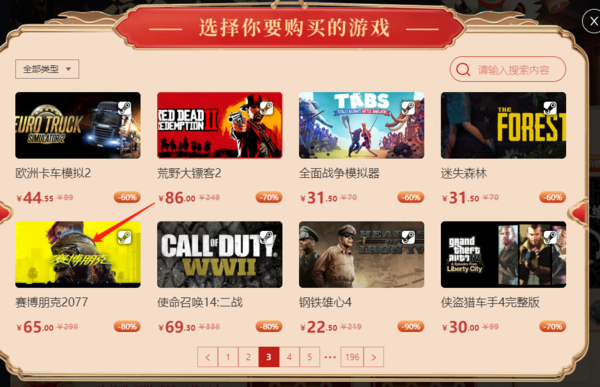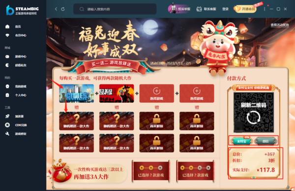 进入后,我们可以看到活动界面,中间有4个【选择游戏】按钮,点击即可从Steambig库中挑选游戏,选完后,对应下面的【随机赠送游戏】会解锁;再往下看,有【古铜钱币】组成的卷轴,意味着我们选3款及以上游戏,即可额外获得3A大作。右侧是付款方式(微信、支付宝),以及二维码支付入口。