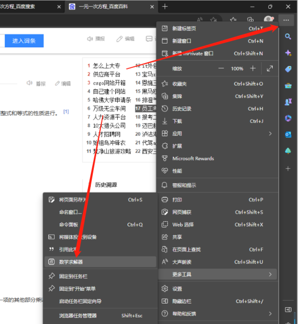 1、我们拿一元一次方程为例子,首先,打开Microsoft?Edge浏览器,在其中打开存在想要求解方程式的网页,之后,点击右上角的【...】菜单按钮,在其中找到【更多工具】,找到【数学求解器】。