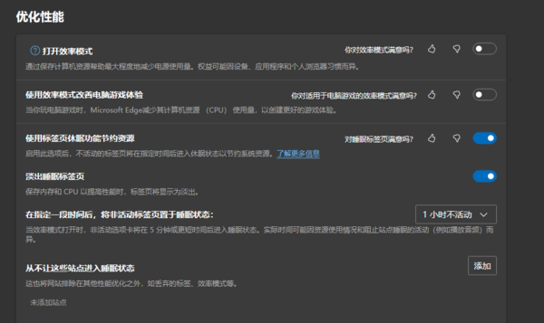 3.?之后,页面会跳转至【设置】-【系统和性能】-【优化性能】,这里我们可以对效率模式进行开关和设置,如图,我们可以开启效率模式的一些子功能,比如我们可以打开【睡眠标签页】功能,来使得不活动的标签页将在指定时间后进入休眠状态以节约系统资源。或者调整【睡眠状态】使得非活动选项卡将在?5?分钟或更短时间后进入睡眠状态,实际时间可能因资源使用情况和阻止站点睡眠的活动(例如播放音频)而异。